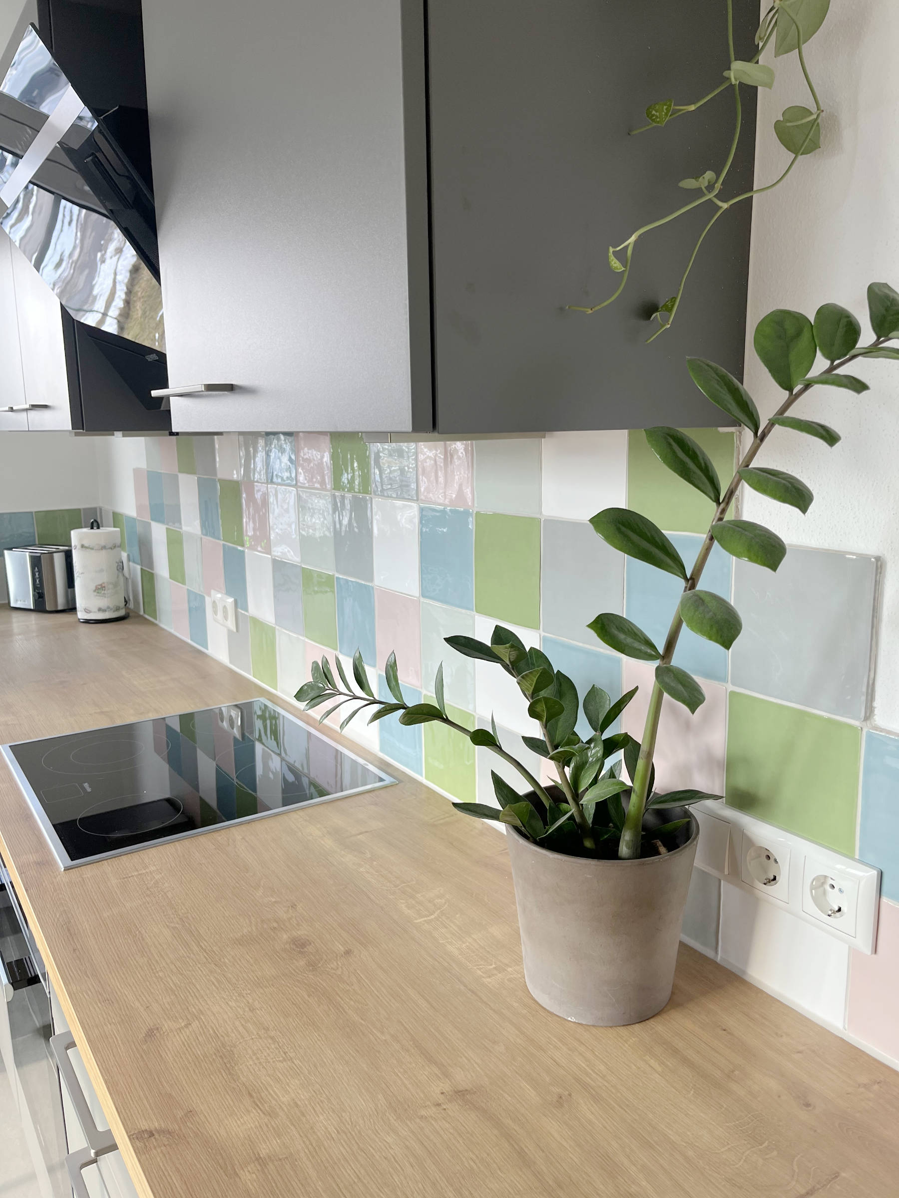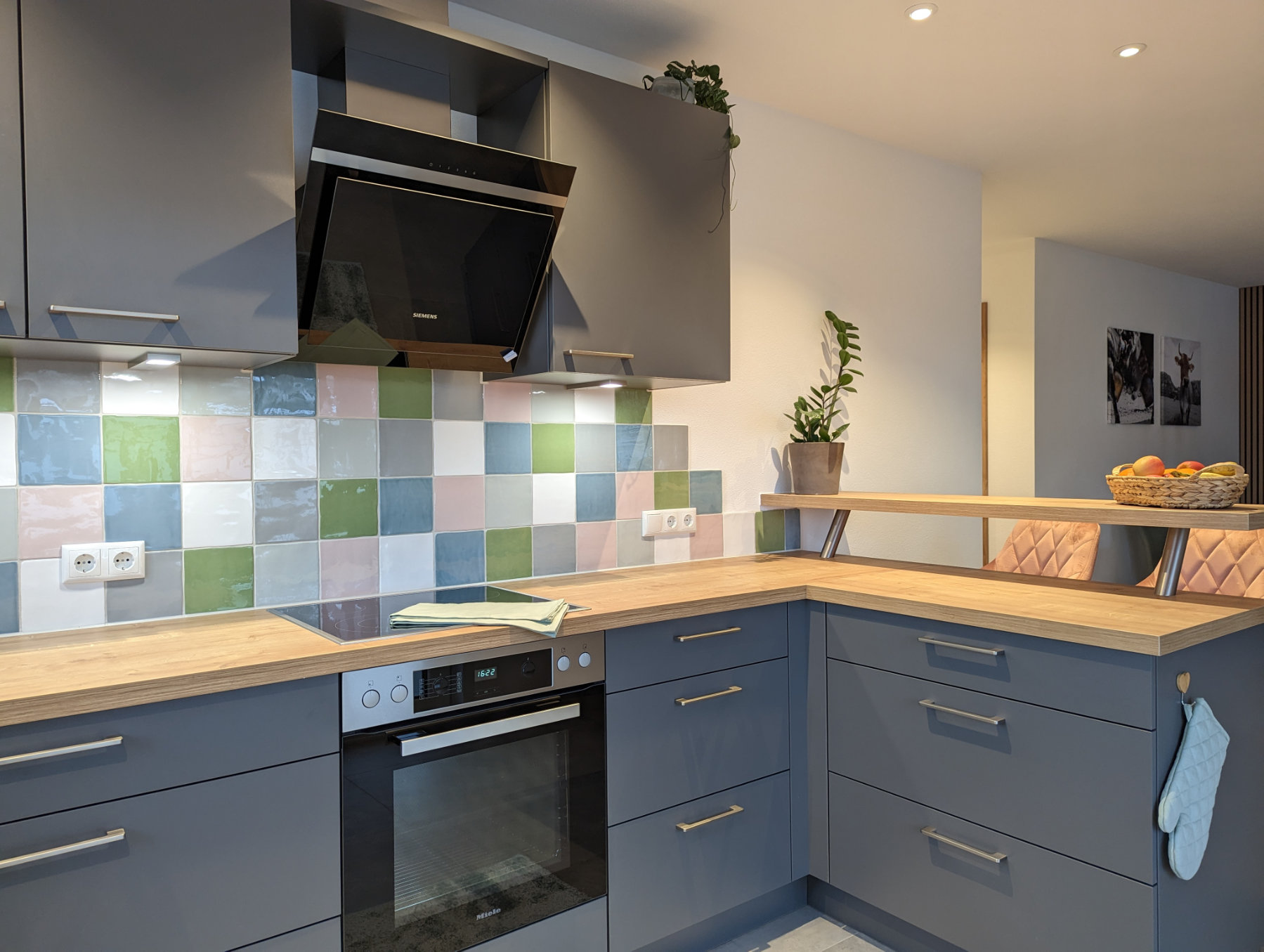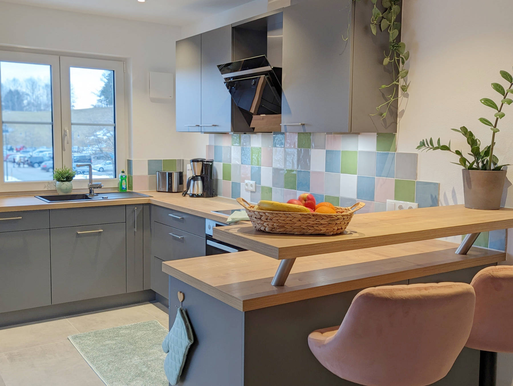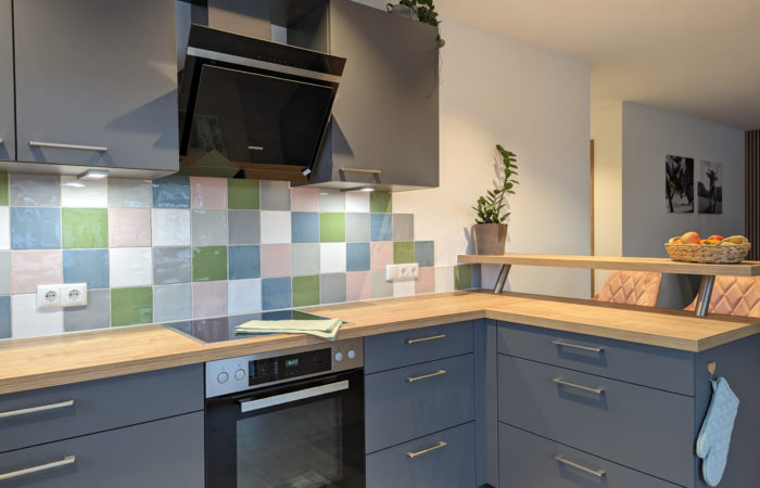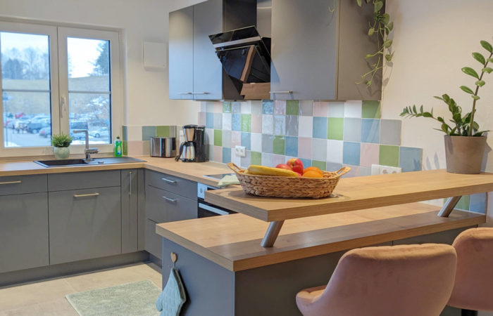 Die Wohnküche mit vollausgestatteter Küchenzeile enthält Herd, Backofen, Küchenutensilien, Gläser, Geschirr und Besteck, Spülmaschine, Kaffeemaschine, Wasserkocher, Kühlschrank, Gefrierschrank, Toaster & Wasserkocher.