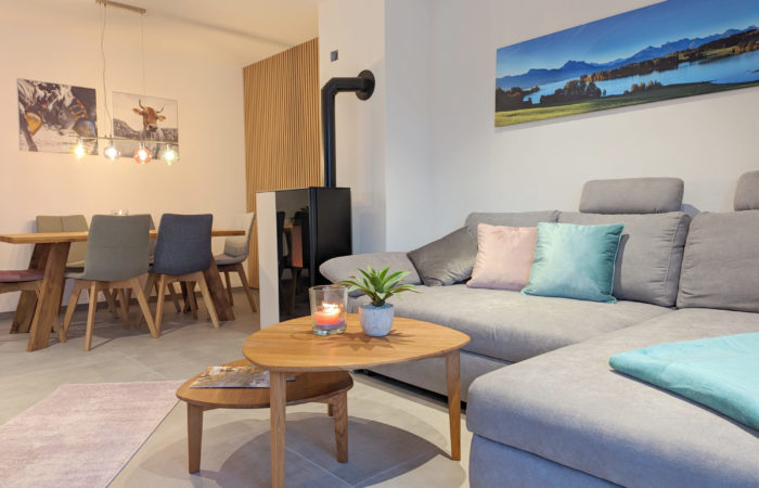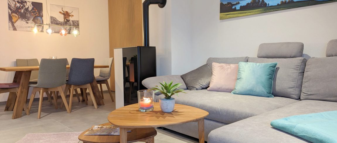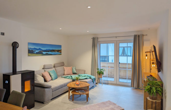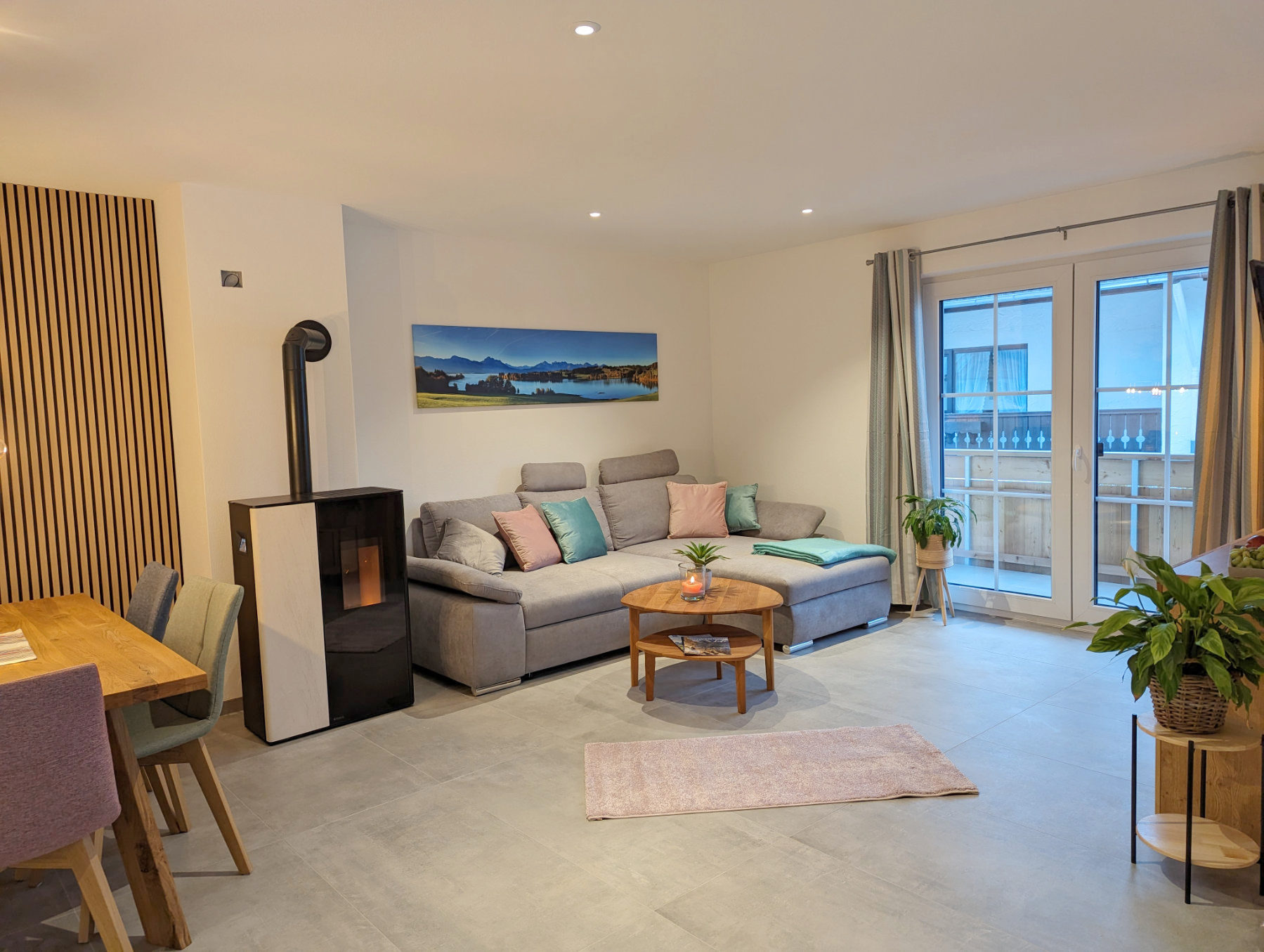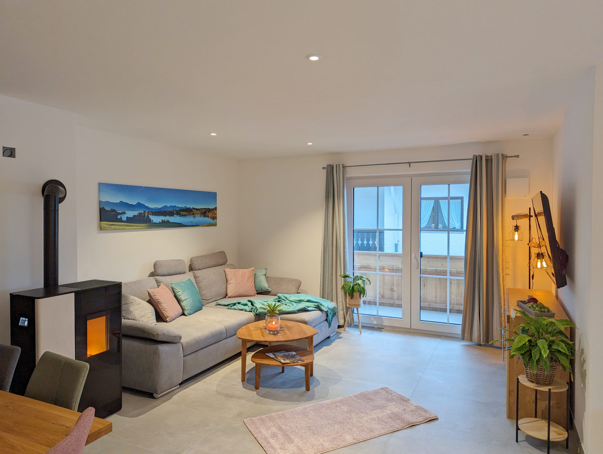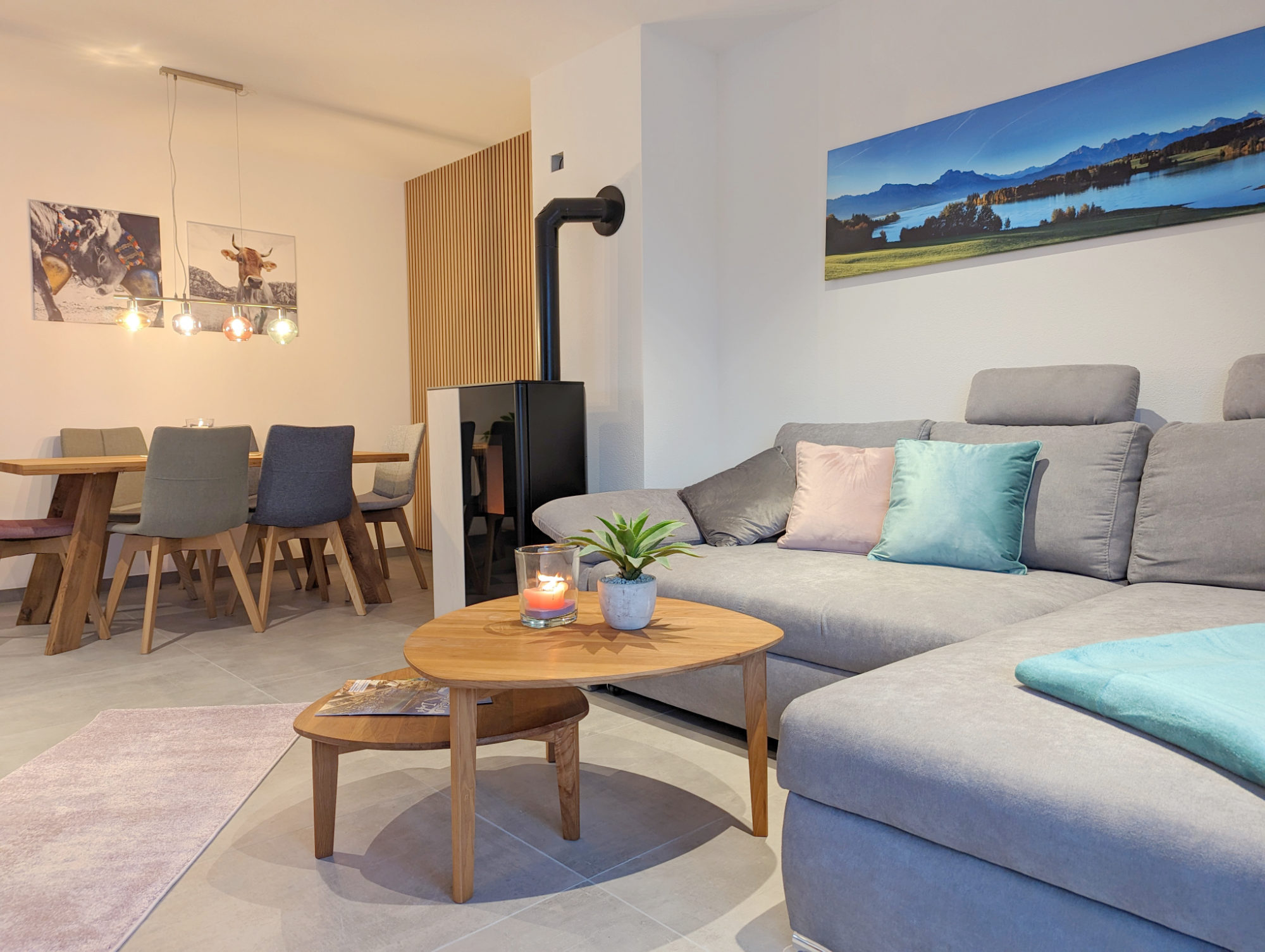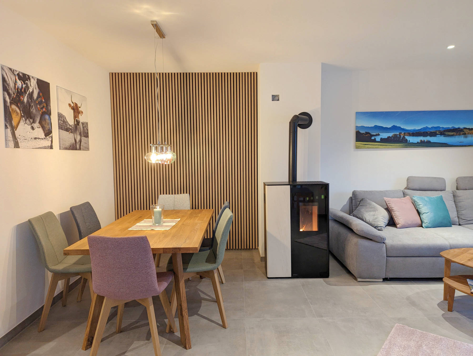 Der große Wohnbereich ist mit Smart-TV, Couch, Ofen und Essbereich eingerichtet.