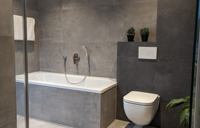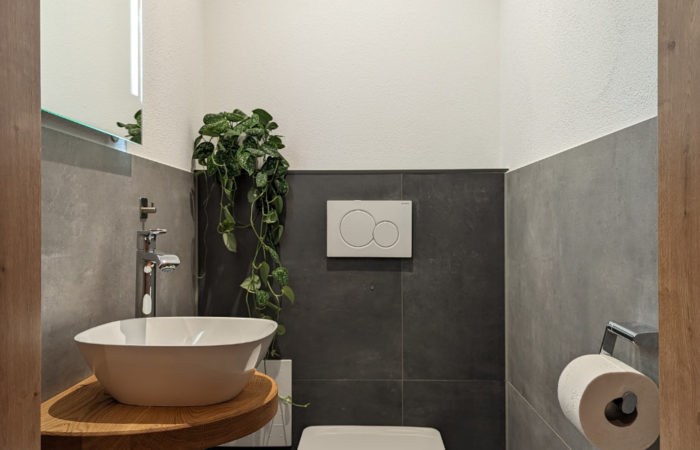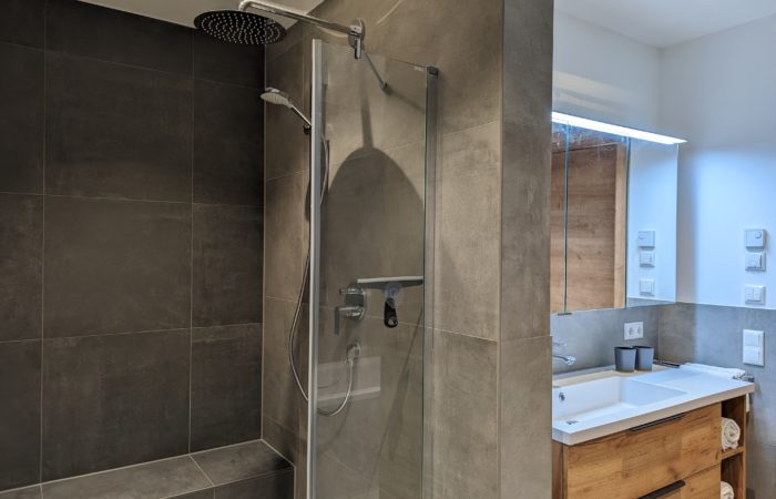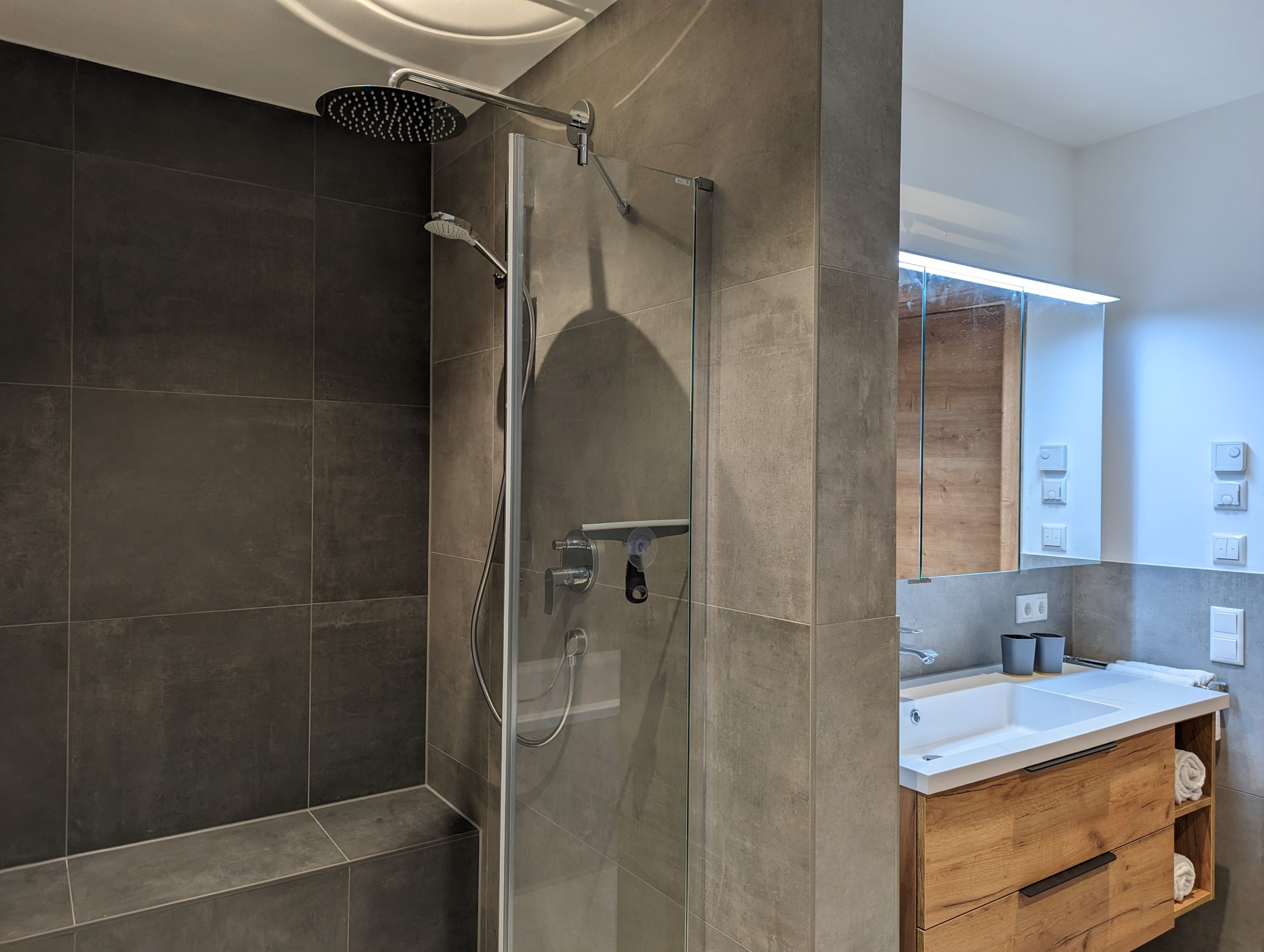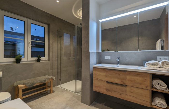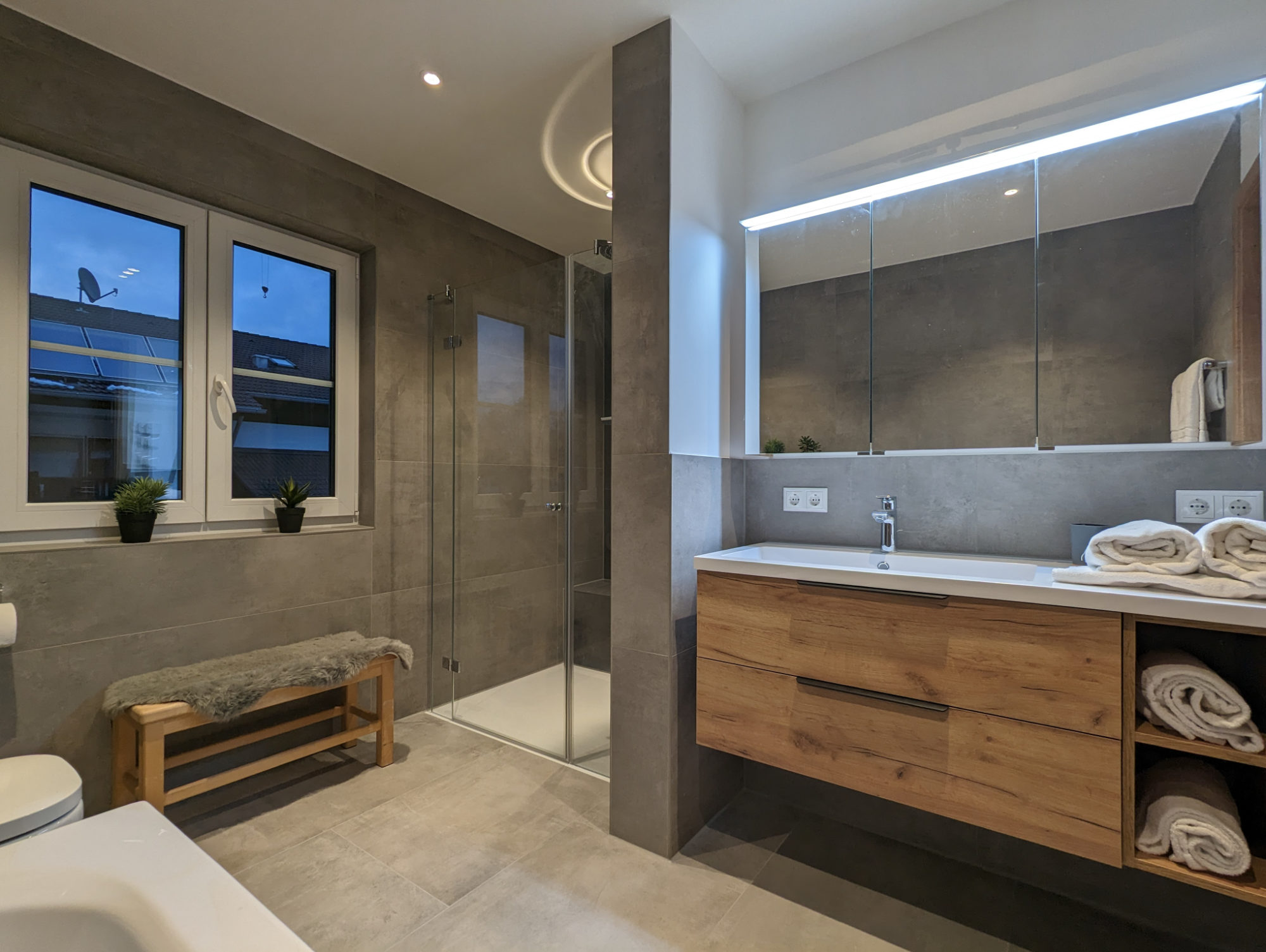 Das Badezimmer ist mit Dusche, Badewanne und zusätzlichem WC ausgestattet.